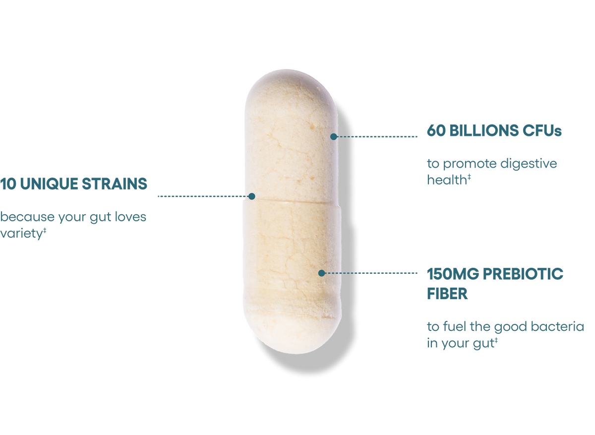 Take 1 capsule of our broad-spectrum 60 Billion Probiotic to support your gut health and overall wellness.